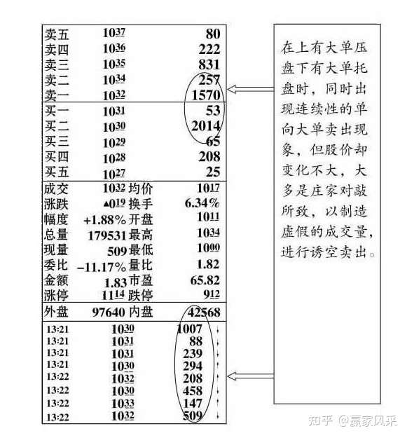 4、在股价经过了较长时间的数浪上涨,股价处于较高价位,成交量巨大,并不能再继续增加,当日内盘数量放大,大于外盘数量,股价将可能继续下跌。