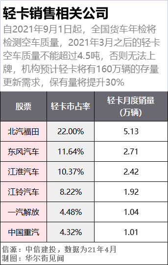 中信建投表示,从政策端来看:2019年以来国家三部委大力整治“大吨小标”现象,加严蓝牌轻卡上牌上路等政策推动存量更新需求,叠加今年9月年检新国标GB38900将正式实施,后续严管政策有望持续落地,大幅削减违规运力,轻卡迎来政策大年,预计2022年行业销量将再上台阶。